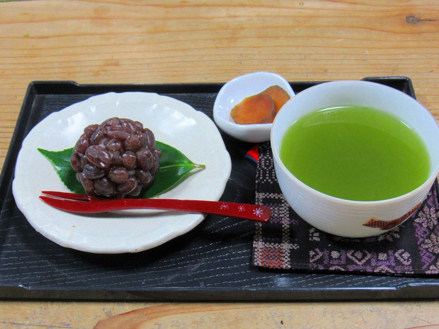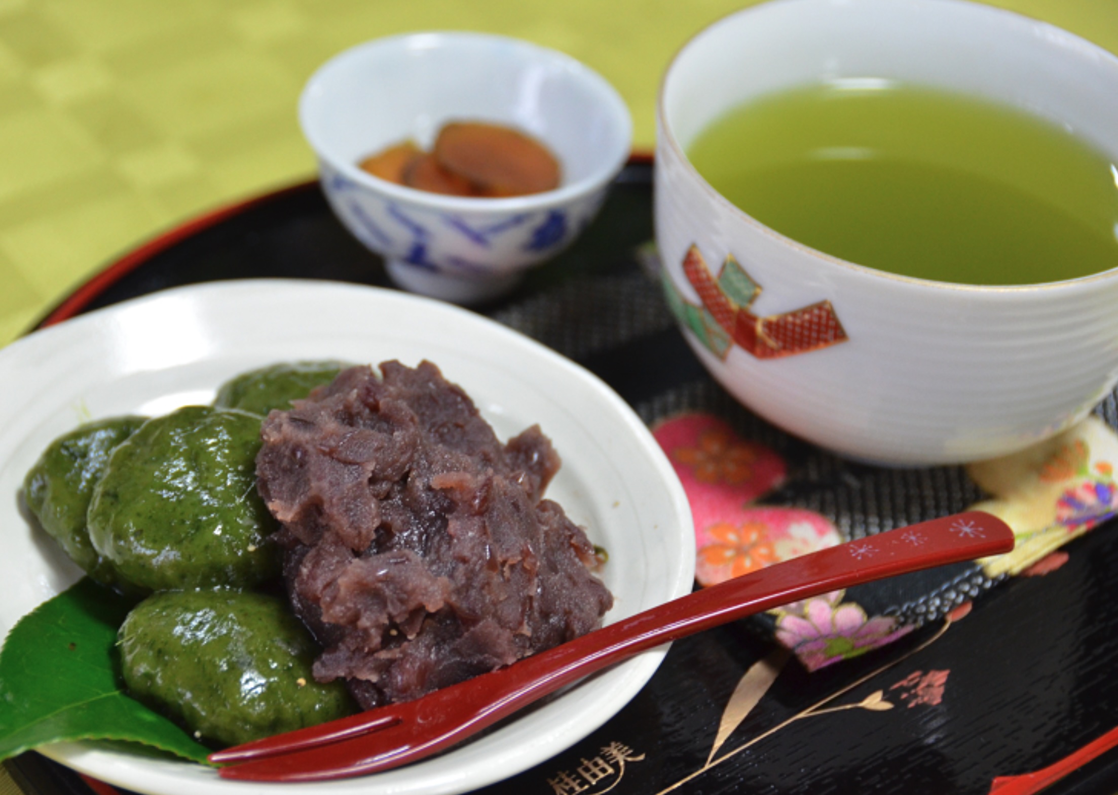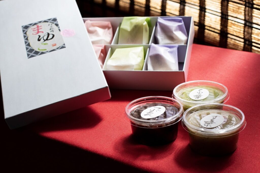 まゆの形をした最中と3種類のあん(桑葉、桜葉、蓬)のセットです。ご自分で自由にあんを最中に入れてお召し上がり下さい。